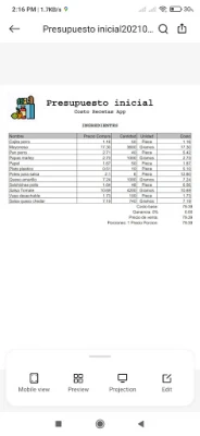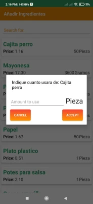 📋 Cost report The app issues a report showing the total cost of materials and how much to sell the recipe based on the desired profit.
